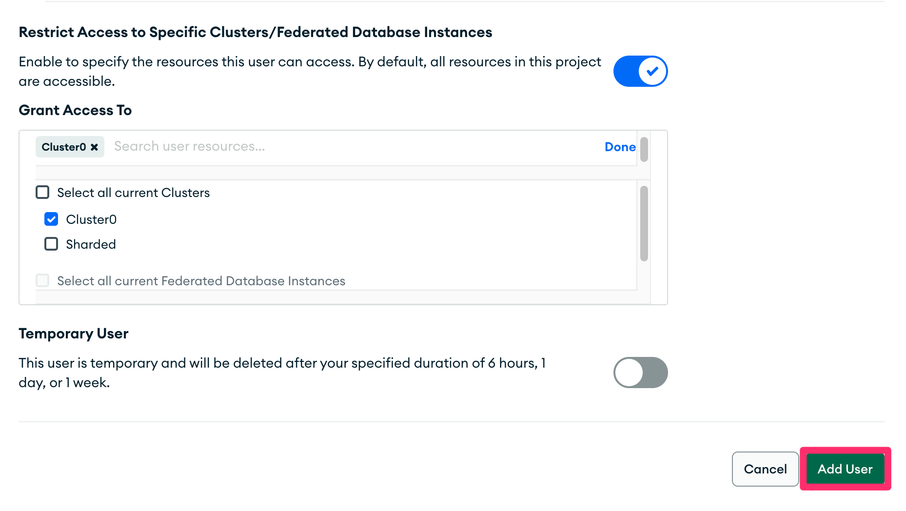 - Enable "Restrict Access to Specific Clusters/Federated Database instances" and enable only those clusters/database that you wish to replicate.